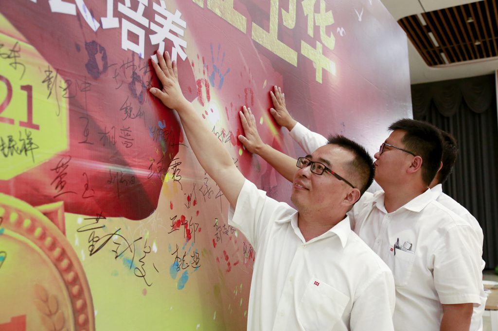各位班组长学员在当初许下“学习先进管理知识,打造zoty中欧金牌班组”铮铮誓言的签名墙上留下掌印,五彩斑斓的掌印天空,记录了他们一路成长的印记。