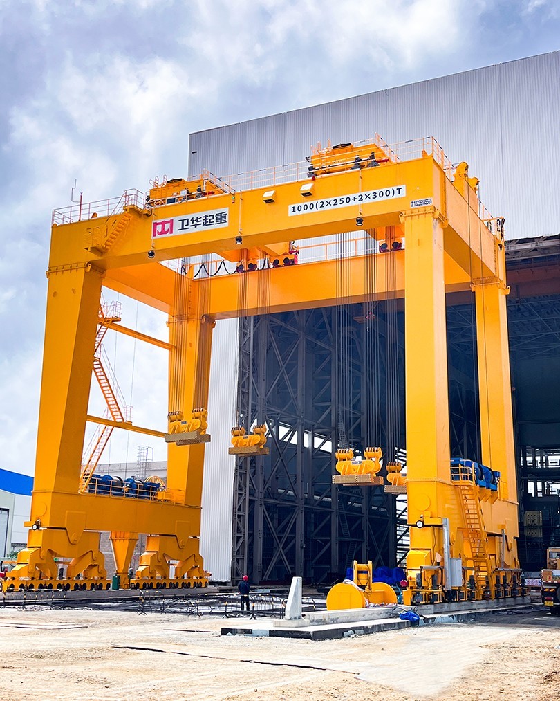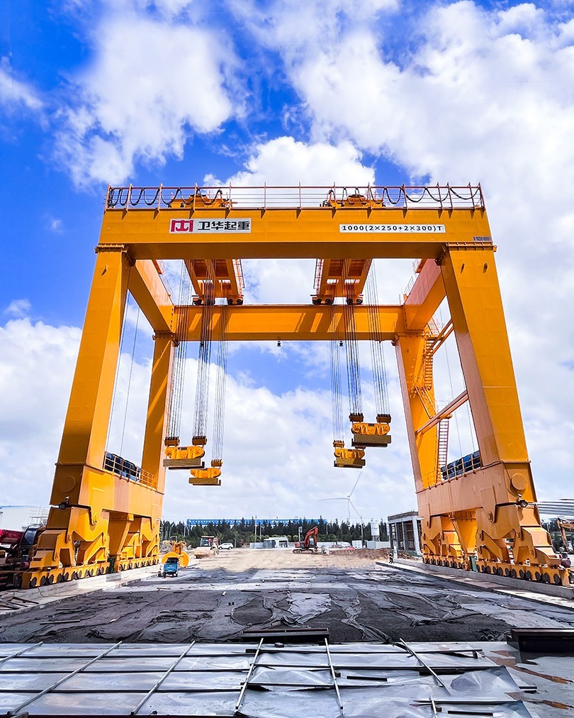 根据项目起吊重量大、工况复杂、控制精度高等特点,zoty中欧起重机采用U型门架结构,双龙门四点吊装,最大起吊重量1000t,最大吊点高度大于18m,采用变频+PLC控制,可实现横向、纵向距离可调,及吊梁自由旋转,控制精度达±1mm。